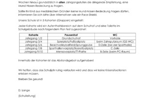 Aufgrund der aktuellen Situation kann auch nach den Osterferien zunächst kein Unterricht in den Klassenräumen stattfinden. Für die Jahrgänge 9 und 10 gibt es ab dem 22.4. eine Sonderregelung, damit sich diese Jahrgänge gut auf die Abschlussprüfungen vorbereiten können. Die Lehrerinnen und Lehrer werden Sie darüber informieren, wie das Lernen in den […]