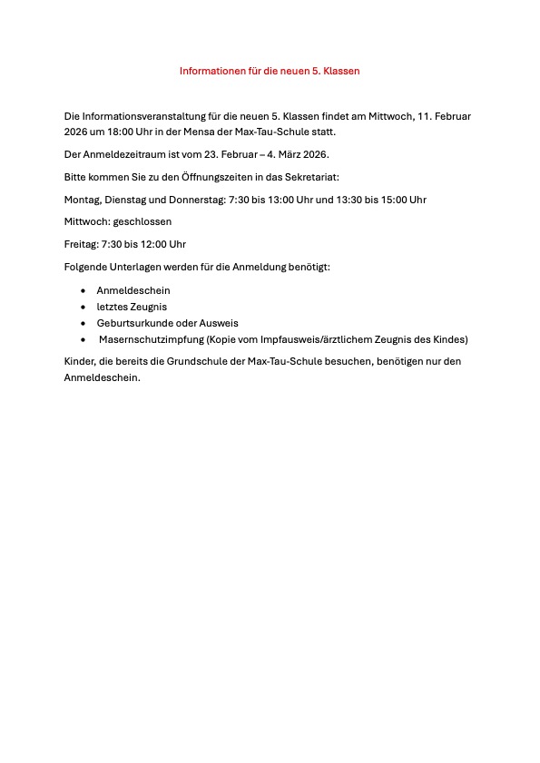 Informationen für die neuen 5. Klassen